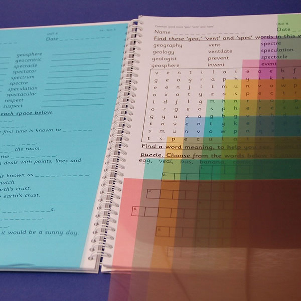 The overlays have a shiny side and a matt side to provide improved usability over a range of lighting conditions. Reading from the shiny side gives a subjectively crisper appearance to the underlying text, but can reflect overhead lighting. The matt side trades slightly decreased clarity for less reflection.
